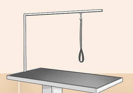 Choose a grooming spot. Pick a consistent spot to groom your pet that will be relatively distraction-free and comfortable. Opt for an easy to clean surface (e.g. the floor, a tabletop, a mat specifically reserved for grooming) that hair will not stick to. A raised surface will limit your dog’s movement and require less effort for you, but be sure that you will be able to lift a fully-grown dog onto it down the line.