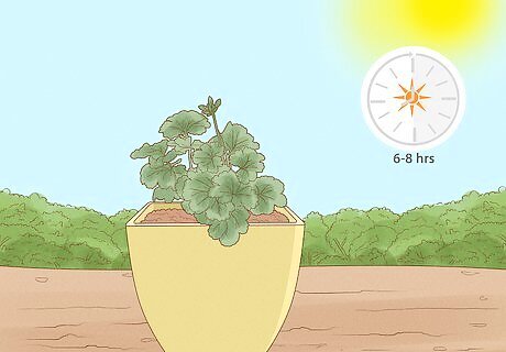 Place the pot in full sun. Geraniums require six to eight hours of direct sunlight to thrive, but some varieties prefer a bit of shade in the afternoon.