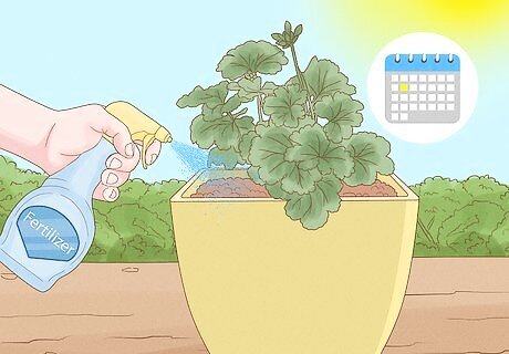 Fertilize your geraniums once a month using a liquid fertilizer. An abundance of fertilizer will cause your geraniums to produce many strong, healthy leaves, but it will also prevent blooms from developing and may lead to a plant with minimal flowering. You can also use a slow-release, granular fertilizer. Only apply this fertilizer once, during the spring.