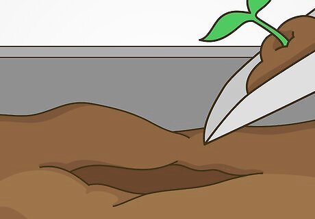 Mark off rows for your seedlings. In your garden, establish each row by putting 2 wooden stakes down, 1 at each end of the row. Tie a string between these stakes to create a straight line. Take your spade and dig a trench directly below the string. Read the seed packet to see how deep the trench needs to be. Small seeds, like carrots, may only need to be 0.25 inches (0.64 cm) deep while others, like corn, may need to be 2 inches (5.1 cm) deep. Keep each row roughly 1 foot (0.30 m) apart. Some vegetables, like cauliflower or broccoli, may need more room than this. Look up recommendations for row spacing for your vegetables.