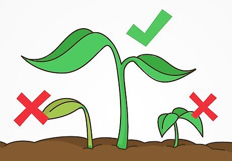 Remove weaker seedlings after the seedlings sprout. Look for any thin, small, or drooping seedlings that are failing to thrive. Remove these weak seedlings by cutting them away with shears or scissors. Thinning out your seedlings will help the stronger and larger seedlings get more nutrients to grow. Thin the vegetables so that there is enough space between each remaining seedling. Typically, you should leave around 1 foot (0.30 m) between each plant, but this can vary by vegetable.