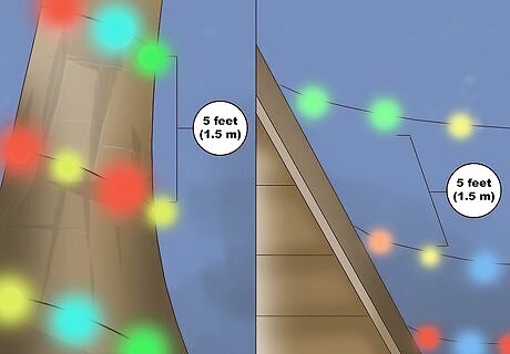 Choose your mounting points. Use eaves, beams, posts, or trees for mounting points. Pick mounting points at regular intervals, such as every 5 feet (1.5 m). Use at least 2 mounting points per string, and make sure that each mounting point is at the same height.