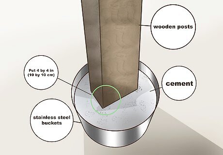 Install wooden posts to anchor the lights to, if necessary. If you don’t have enough existing beams, structures, or trees, you can easily make wooden posts to anchor the lights to. Put 4 by 4 in (10 by 10 cm) wooden posts of the desired height in stainless steel buckets. Mix cement and pour it into the buckets. Allow the cement to dry completely, then place the buckets around your property at the desired mounting points.