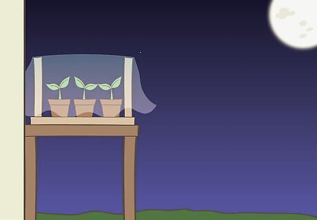 Begin to set plants outdoors in the late evening. Keep an eye on the nighttime temperatures in your area as you transplant seedlings outdoors. Some plants, such as onions, can handle freezing temperatures after you harden off seedlings. Other plants, such as tomatoes, will suffer if the temperature goes below 65 degrees Fahrenheit (18.33 degrees Celsius). Members of the cabbage family can handle cold temperatures but are more likely to bolt, or produce flowers and seeds, if the temperature remains cool for longer than a week. Don't let cabbages sit out in temperatures below 40 degrees Fahrenheit (4.44 Celsius). Place the seedlings near a wall of your house in the evenings at first, so they will benefit from the warmth of the house. The walls will protect the seedlings from wind.