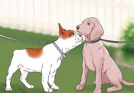 Socialize your Weimaraner. Weimaraners can be wary of strangers. Socializing your Weimaraner throughout its life will help it feel comfortable with new experiences, other dogs, and other people. It will also help your Weimaraner feel confident, stable, and happy. Examples of socialization are: Scheduling play dates with friendly dogs Introducing your Weimaraner to friendly friends and family Varying the route of your walks so that you meet new people and dogs Taking your Weimaraner to a dog park