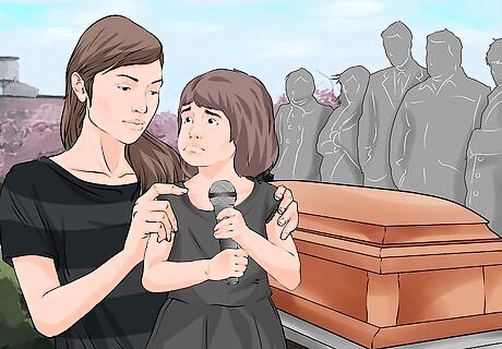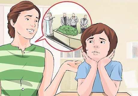 Include your child in any funeral arrangements. This is vital to helping your child accept the loss of a loved one more fully. It is also an important way to make your child feel included in a series of events that will significantly affect their family. Aside from infants, this applies to children of all ages. Never prevent a child from participating in a funeral if they want to do so. This may directly lead to feelings of confusion and rejection. . Explain that funerals help people say goodbye to people who have died. Tell them that there will likely be people crying at the funeral, and that it’s entirely okay if they cry as well. Plan a specific roll for the child. (You can also ask the child what they would like to do.) Rehearse whatever roll the child will fulfill. For example, have the child place something of their choosing in the casket. If you are not able to do so, have a friend or family member stay with a small child during the service. They may want to leave or need to be held at some point. On the other hand, don’t force a child to participate or attend. Some children may simply not be ready for the emotional intensity of a funeral service. If a young child is uncomfortable with the idea of attending a funeral, offer some alternatives to help them achieve closure. Mention planting a tree or releasing balloons in memory of the lost loved one, or ask if they have any ideas.