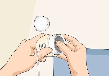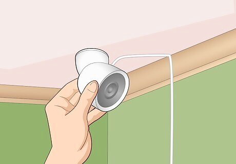 Mount your camera from a ceiling or window for a birds-eye view. Screw the plate into the wall, securing your Nest camera. You can do this on the ceiling, top of your walls, or right above your windows for a large range of view. Because your camera will be out of most people's line of sight, criminals can overlook cameras placed here. You can also purchase a colored silicone Nest camera skin in the color of your wall or ceiling for extra camouflage.