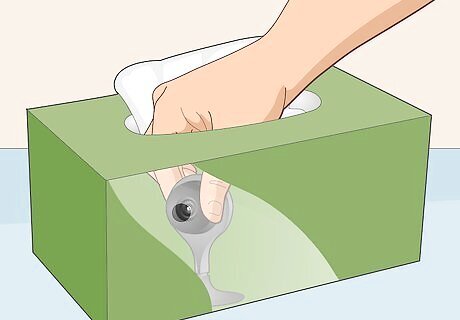 Use a tissue box to disguise your camera if you are on a budget. A tissue box is a common, inexpensive household item that can easily turn into a Nest camera hiding spot. Take out all of your tissues and place your camera inside the box. Cut a small hole for your camera’s lens in the cardboard, using an X-ACTO knife or scissors. Line your camera up with the hole, and replace the tissues. To measure the hole, line up your camera so it is flush against the cardboard. You can either trace the lens or approximate the size. Remember to add a tissue coming out of the top!