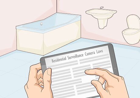 Check security camera placement laws so you don’t invade privacy. It is legal to record videos indoors and outside, generally speaking, as long as you are within your home or filming in public. These laws vary from country to country, and even state to state, so research online before you record without consent. In the United States, many states have laws against violating privacy when recording, like in bathrooms or personal bedrooms. There are different laws if your intent is based on distributing recordings, selling your videos, or using footage in court. Make sure to research this accordingly.