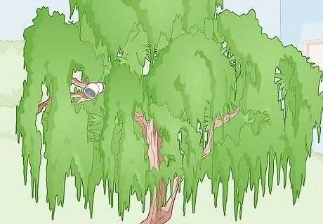 Hide your camera in trees or bushes for an easy, free hiding spot. Place your camera inside your bush or tree, securely perched on a branch so it doesn’t fall. You can cover some leaves around the camera so it’s even more discreet. You can also use a tripod mount and wrap it around a branch for a more secure hold. Place your camera in off-street trees and bushes, if you would like to record unobserved areas.