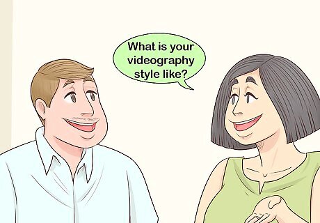 Ask the video professional questions about their work and process. Ask them questions such as, “What is your videography style like?” or “How would you describe your editing process?” Make a list of questions that you’d like to ask the videographer beforehand so that you make sure you have all the information you need. Other questions might be, “Do I get to choose the song that goes in the video?” or “How many weddings have you filmed?”