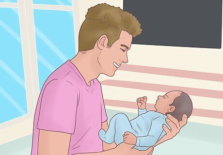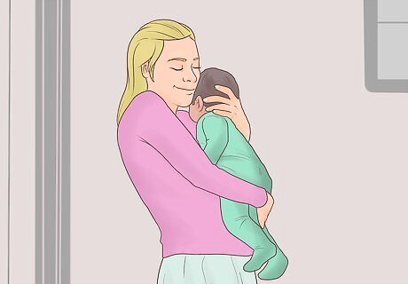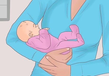 Keep the baby’s head and neck steady with your hand. Scoop the baby into your arms, keeping their neck and lower head supported as you lift them up. Bring the child up slowly, keeping your motions steady as you bring the child to mid-chest level.