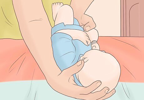 Support the baby’s bottom and neck as you lift them upright. Keep 1 hand snug against the back of the infant’s head and the base of their neck. Next, position your other hand along the infant’s bottom. Keep your hands rigid while you lift, as you’re providing the only source of support for the baby. Hold the baby in the same way that you’d carry a heavy grocery, like a sack of flour.