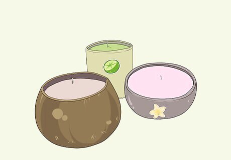 Set out scented candles. Choose candles in scents like coconut, lime, plumeria, or ocean air. Set them around your space to give off tropical scents and set the mood.