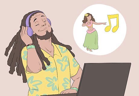 Listen to Hawaiian music. Get a CD of Hawaiian music or download Hawaiian .mp3s from the internet. For relaxing moods, you could play Kapena or Israel Kamakawiwo'ole. Or, choose upbeat music like Three Plus or Ten Feet. Research local artists, such as Pepper and Jack Johnson. Another option is to hire Polynesian drummers or Hawaiian musicians for your party.