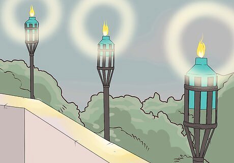 Put out tiki torches. Tiki torches are reminiscent of Hawaiian beach parties. Grab some from a party supply store or garden store, and firmly stake them around your yard. Depending on where you live, tiki torches may be hard to find. You can substitute them with any kind of outside light such as lanterns. Keep a fire extinguisher handy in case of any accidents.