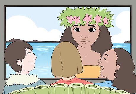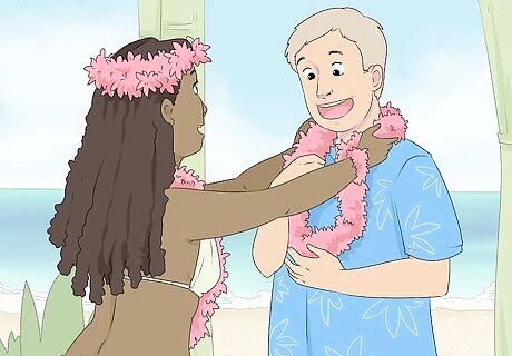 Give your guests a lei as they arrive. If you are planning to make real flower leis, you can make them the night before the party. If not, paper leis are great as well. Place one over the head of each guest as they arrive to get them in the spirit of the party.