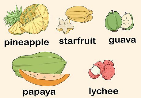 Set out fresh fruit. Pineapple, guava, papaya, lychee, and coconut are perfect for a Hawaiian party. You could also add dragon fruit, bananas, starfruit, and raspberries. Serve them separately, or slice them up and make a big fruit salad for your guests.