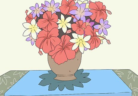 Use bright colors. Hawaii is green, lush, and filled with tropical flowers. Emulate the Hawaiian landscape by decorating your space with bright colors. Choose tablecloths in bright colors like red or blue or prints such as flowers or tiki masks. Add accents in complementary colors.