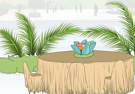 Make Hawaiian centerpieces. You could fill vases or bowls with fresh flowers, such as plumeria, hibiscus, or bird of paradise to give your tables a Hawaiian feel. Another idea is to fill small buckets with sand and place shells, flowers, or even tea lights in the sand. You could even hollow out a pineapple and fill it with flowers or tiny paper umbrellas.