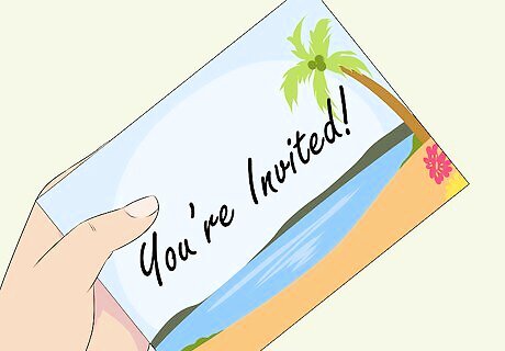 Send themed invites. Invite friends, family, or neighbors to your party. Send, or email, Hawaiian-themed invitations. You could decorate the invitations with palm trees, hula girls, or surfers. You could also choose invitations with beach themes, flowers, or ocean scenes.