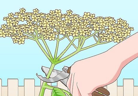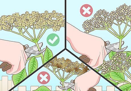 Use scissors to cut flower heads off where the small stems meet the main stem. Use a small pair of sharp scissors to cut off flower heads right below where the florets attach to the main stem. The main stem is not usable in any kind of recipe, so take as little of it as possible with the flowers.Tip: The scent of elderflower attracts many insects. Gently shake off the bunches of flowers after cutting them to knock loose any insects hiding in them. Rinse off the flowers in clean, cool water before you use them. The best time to harvest the flower heads is on a warm, sunny day when they are fully open and dry.