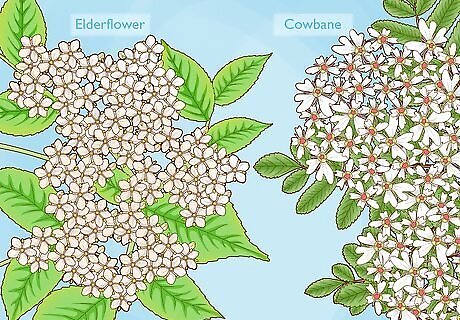 Look at the flowers closely to verify that they are growing from the elder tree. There are several other common plants with similar clusters of white flowers that can be confused with elderflower. Elderflower only sprouts from the branches of the tree, not from stems in the ground, so look carefully at where the clusters of flowers are growing from.Warning: Never eat any kind of plant that you cannot identify with complete certainty. If you aren’t sure, then you can get a field guide or look at pictures online to help you identify elderflower and distinguish it from other similar flowers. Cow parsley and cowbane are 2 plants that grow from stems in the ground and can be confused with elderflower because of their clusters of white flowers. Cowbane is very poisonous.