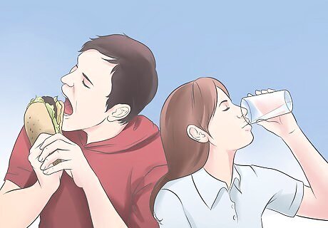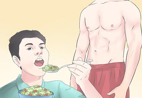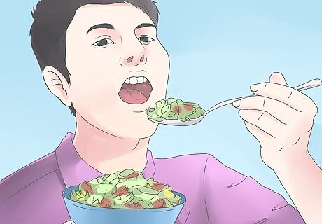 Eat more fruits and vegetables with every meal. Increase the amount of fruits and vegetables you eat at every meal, as this will help you to feel full and make you less inclined to eat unhealthy foods that cause a spike in your blood sugar. At least half your plate should be filled with fruit and veg at every meal. Try starting meals with a salad or a broth or tomato- based soup with lots of vegetables. This helps you eat more good-for-you veggies while filling you up before you get to the higher fat and calorie courses. Remember that fresh fruits and vegetables are usually healthier than canned or frozen.