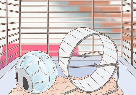 Place hamster toys inside the hamster cage. Hamsters need and enjoy exercising, and will happily play with toys for hours. Place hamster toys such as a hamster wheel and hamster ball into the cage. Choose a hamster wheel that is the correct size for the length of your new hamster. Spread the toys out so that your hamster can easily run between them. Toilet paper tubes and brown boxes are fun inexpensive toys for your hamster to play with.