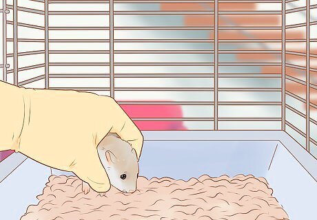 Place the hamster into its cage. Use gloves to carefully transfer the hamster into its new cage. Quickly fasten the door so that the hamster doesn't escape. Place Syrian hamsters in their own cages. These hamsters are extremely territorial and will fight if they are left in the same cage. Hamsters do not get lonely. This means that it is fine to keep them in a cage by themselves. Dwarf hamsters can be safely kept in the same enclosure.