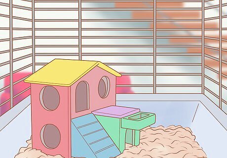 Put a hamster house into the cage. This gives the hamster a private space to sleep and rest. Choose a home that is large enough for the hamster to turn around in. Place the hamster house at the end of the cage furthermost away from the door. If you have multiple hamsters in 1 cage, choose a large house to give the hamsters plenty of room.