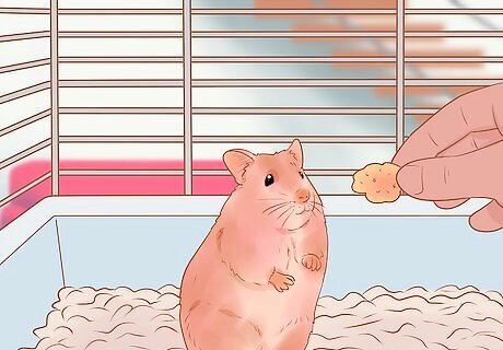 Feed the hamster treats out of your hand once it used to your voice. Once your hamster stops hiding from your voice, place your hand in the cage and let your hamster sniff it. After this, slowly place a hamster treat in your hand and wait for it to eat it. Purchase hamster treats from a pet store. If the hamster won’t eat the treat, continue to talk to it and try again tomorrow.