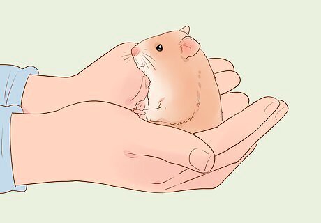 Pick up the hamster once it is comfortable being touched. When the hamster confidently eats off your hand, it is ready to be picked up. Once the hamster is sitting on your hand, slowly raise your hand off the ground and cup your other hand over the hamsters back. Avoid lifting the hamster too far off the ground at first, as it may jump out of your hands. If the hamster jumps off, simply place a treat in your hand and try again. Over time, your hamster will become more confident and will jump into your hand and run up your arm.