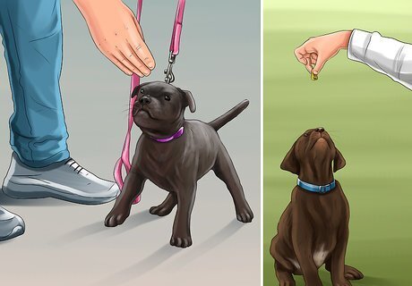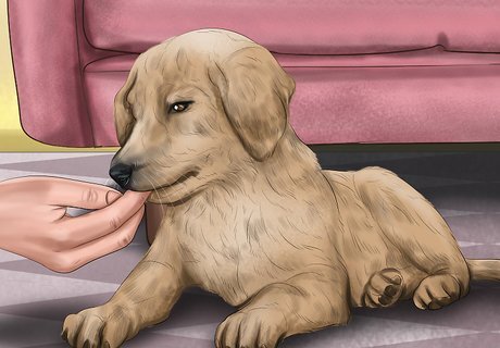 Train your puppy to sit. Kneel in front of your puppy and hold a treat in front of it. Slowly lift the treat above its head, which should prompt it to sit. Praise your puppy and give it the treat. If your puppy doesn't sit, place your hand on its behind and gently guide it into a sitting position, immediately offering praise along with the treat once it's sitting.