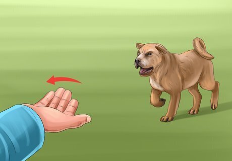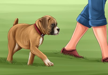 Teach your puppy to come to you. Teaching your puppy to come to you on command is a simple but important training step that can keep your dog out of trouble (e.g. to keep your puppy from running off or approaching a dangerous situation). Start by squatting down in front of your puppy, opening your arms, and saying "come here". If your puppy moves toward you, offer it ample praise as well as a pat on the belly or head. If your puppy does not come to you, gently approach it, attach its leash, and guide it towards the spot you called it to, praising it along the way to create positive associations.