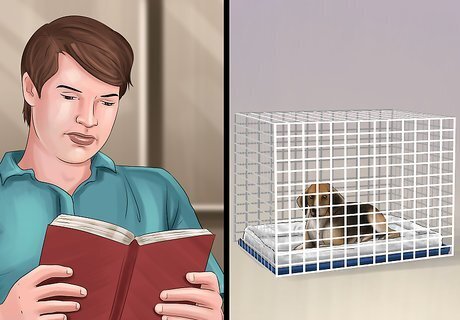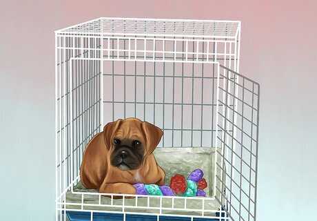 Buy a crate. Crate training is a way to condition your puppy's behavior, help with house training, and stop it from acting out. A dog’s crate should be a place it feels safe in and wants to inhabit. Buy a crate that will accommodate your puppy when it has grown to its full size. Your puppy should have just enough room to stand up, turn around, and lie down comfortably, so use a divider to block off part of the crate while your puppy is still small. Visit the Association of Professional Dog Trainers website at https://apdt.com/resource-center/choosing-right-crate-size/ to see what size crate your fully grown dog will need.