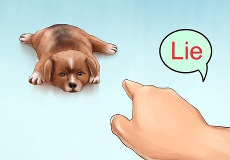 Teach your puppy to lie down on command. Kneel next to your puppy and gently place on hand on its shoulders. Hold a treat in front of its face and give the command "lie down", slowly lowering the food in front of its face towards the ground and guiding it downward with the other hand. Once your puppy is all the way down, praise it and give it the treat.
