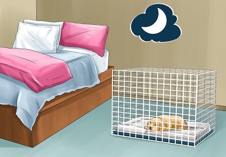 Crate your puppy overnight. Try crating your puppy overnight, keeping the crate in your bedroom at first so that you can let your puppy out if it needs to relieve itself during the night. When your puppy starts sleeping through the night without trouble (e.g. whining to be let out), try moving it to another room. As your puppy gets older, it should sleep through the night without anxiety.