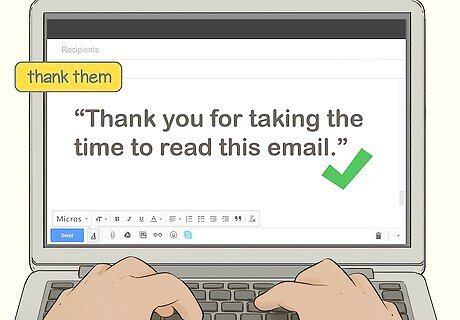 Thank the recipient for their time. No one likes going through all of their email, so make sure to thank your recipient for taking the time to read yours. This simple courtesy will greatly improve your recipients mood and increase the chances of you getting a response. "I appreciate you taking the time to read this email." "Thank you for taking time out of your schedule to read this."