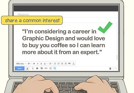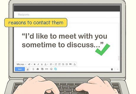 Give your reason for getting in touch. Don't wait too long to get to the point. No one is going to read an email that is multiple paragraphs long before anything resembling the point appears. Explain clearly and straightforwardly what you want and why you're contacting that person about it. If you are asking for advice or making some other request, make sure it is manageable, especially if this is your first contact. "I'm interested in learning more about..." "I'd like to meet with you sometime to discuss..." "I would like your opinion on..."