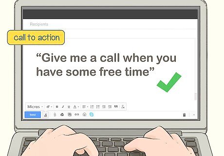 Provide a call to action. Ask the recipient to write you back, call, think about your proposal, or anything else to get them engaged. Asking a question is another great way to increase engagement. "Give me a call when you have some free time" "Let's meet for lunch sometime soon" "What are your thoughts on...?" "I look forward to your response"