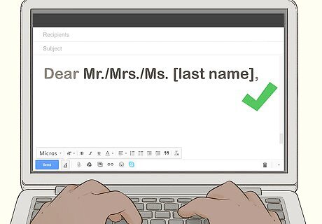Open with a business salutation. Don't start off with "Hello" or "Hi". You can use greetings like that once you've gotten to know the person. Start off with a tried-and-true business greeting. Avoid using the recipient's first name in the salutation. "Dear Ms./Mr./Mrs." - If you are at all unsure about the marital status of the female you are emailing, you should always default to using "Ms." as it is less presumptuous. "To whom it may concern" - This should only be used if you are not sure who will be receiving the message.