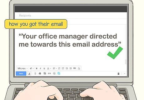 Explain how you got the recipient's email address. Let the recipient know how you found out their contact information. This helps show that you went through the proper channels to reach them. "Your office manager directed me towards this email address" "I found this email address on your website" "So-and-so said that I should get in contact with you"