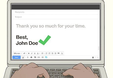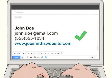 Include your signature. If you haven't configured your email service to include your signature, make sure to end with your name, title, and contact information. Don't overload this part with five phone numbers, two email addresses and three websites. Keep it simple so that the recipient knows the best way to get back in touch with you. Avoid including quotes in your signature. Joe Smith [email protected] (555)555-1234 www.joesmithswebsite.com