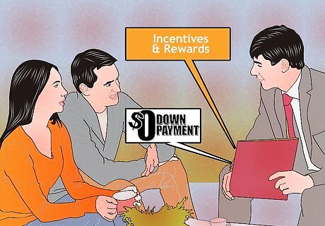 Learn what cash incentives are available to potential buyers. Ask the listing real estate agent or look for incentives that are mentioned in the property's For Sale ads. Seek out properties that have been on the market for a long time, or have something so badly wrong with them that the bank or seller is willing to pay you to purchase the property. Or you can suggest incentives during the negotiation process. Cash incentives may include: Cash-back offers. These could include offering to pay a year's worth of property taxes or mortgage payments. Other types of cash-back offers include credits for a down payment, repairs, landscaping, closing costs or mortgage points. Expensive gifts such as season tickets to sporting events, use of a vacation condo, gift certificates for high end purchases, golf club memberships and even mineral rights. Seller-financed carry-back loans which are mortgages or loans financed by the seller. Sometimes this is included with a zero down payment incentive. However, keep in mind that this can be a risky option if the seller does not transfer ownership or allow you to have the property recorded to your name. The property may not be transferred until a certain amount of money has been paid into it, so it is possible that the owner could foreclose on the property even if you are paying them every month.