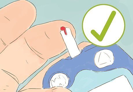 Take your blood sugar. The first step in keeping a record of your readings is taking your blood sugar. Your blood sugar is a measurement of how much sugar is in your blood. Wash your hands first. It's important to start with a clean hands, as you can introduce infections with the lancing device. Another option is using an alcoholic wipe on the area where you're going to lance. Turn on your meter, and put a testing strip in it. Place the lancing device on the appropriate area. Most of the time, you'll use the side of your finger. However, some devices let you use other areas, such as your thigh or arm. If you suspect high or low blood sugar, it's best to use your finger, as it has the most up-to-date blood sugar level; glucose gets to the fingertips faster than other sites. Prick yourself. Draw the spring end of the lancet out and let go, allowing the part up against your skin to prick you. Watch for the blood to start pooling up. If it doesn't, you can squeeze your finger a bit to push out the blood. Use the end of the strip to catch the blood. The strip should soak the blood up, and a reading will pop up on your meter.