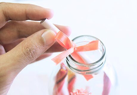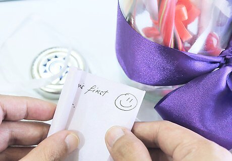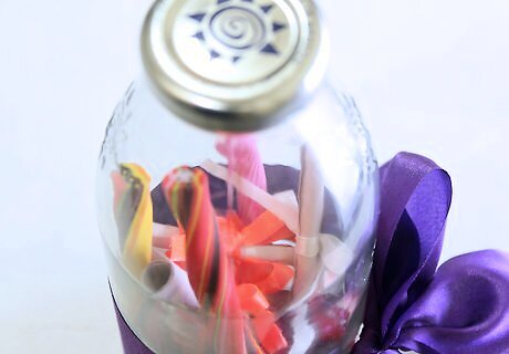 Make deposits into the happiness jar daily. The idea is somewhat to use it daily but life can get busy and events intervene, so if you miss days, don't be fussed; just pick it up from where you left off. Set a daily reminder or alarm on your phone. Keep the jar in a safe place where it's less likely to be bumped or in the way of everyday activities but ideally, it should be in sight to remind you to use it. If the jar has a lid, keep the lid on in case it gets knocked over. This also keeps the dust out, especially important if your jar is very large and will be sitting in the same spot for months or years.