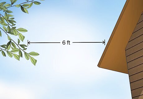 Trim all tree branches to be at least 6 feet (1.8 m) away from the house. Keep any access point to the house a safe distance away from any trees or tall plants, as some rats like to climb trees and leap to higher points of access in your home. Additionally, cut away or trim any ivy or other thick bushes and plants that can provide cover and shelter for rats. Points of access include the rooftop, vents, utility lines, or eaves. Make sure that no rat can jump from a branch or shrub to any of these areas.