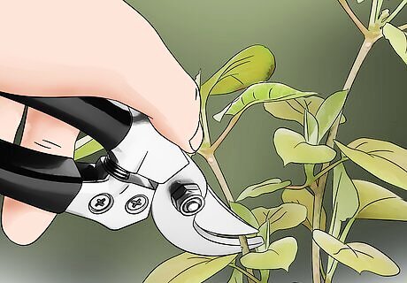Prune affected portions of your plants. If you notice webbing on branches or spots on your leaves, you should prune these parts of the plant with hand pruners or shears. Discard the infested parts of the plant in the trash. Throwing away mite infested portions of a plant near your garden may spread mites to other plants.