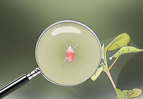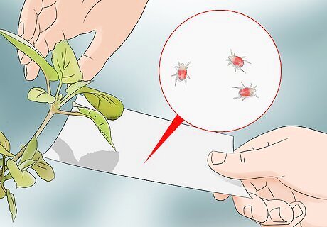 Shake your plant's leaves over a white piece of paper. If you don't have a magnifying glass, you can use a white sheet of paper to see the mites. Hold a piece of paper under the leaves of your plant and then shake them. If you see green, brown, or black specks start to move over the surface of the paper, you have spider mites. You can also crush the bugs with your finger. If they streak green, they are plant-feeding mites. If they are orange or yellow, they are probably beneficial predators.